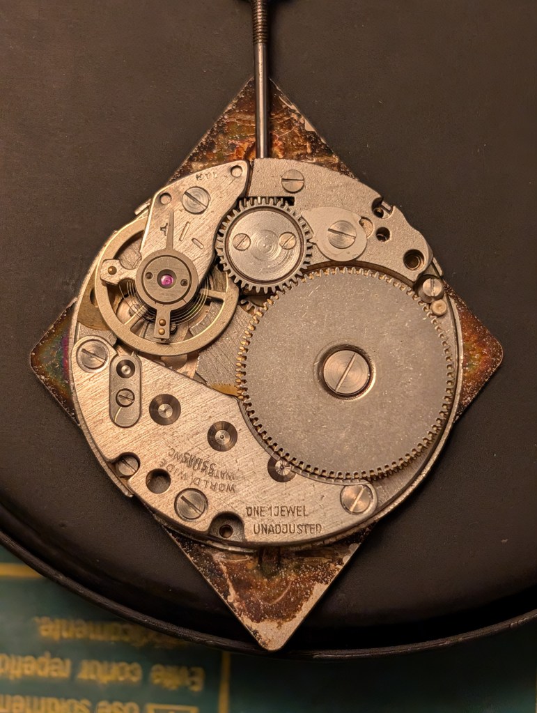 The gold-colored case had an unusual asteroid shape. The crystal was a bit scratched. The dial had a fabric-like texture with numerals at 3, 6, 9, and 12. “Unbreakable mainspring” indicates that it’s an older watch, as newer watches no longer (falsely) advertise something that can’t break. The only hands are hours and minutes. (The image above was taken after opening the case already, since I forgot to take one before opening it, ha).