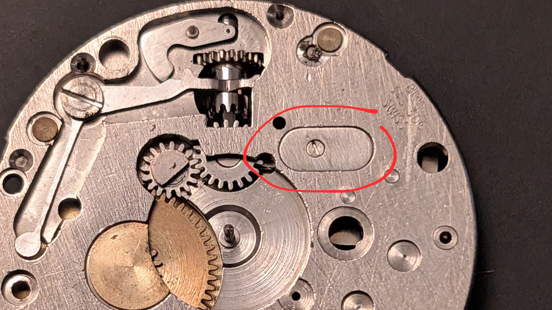 - The top pivot of the balance has the single jewel, and the bottom pivot looks like it has some kind of shock absorber via a thin pill-shaped plate with a single screw.