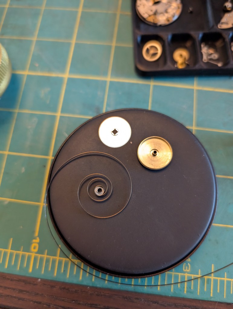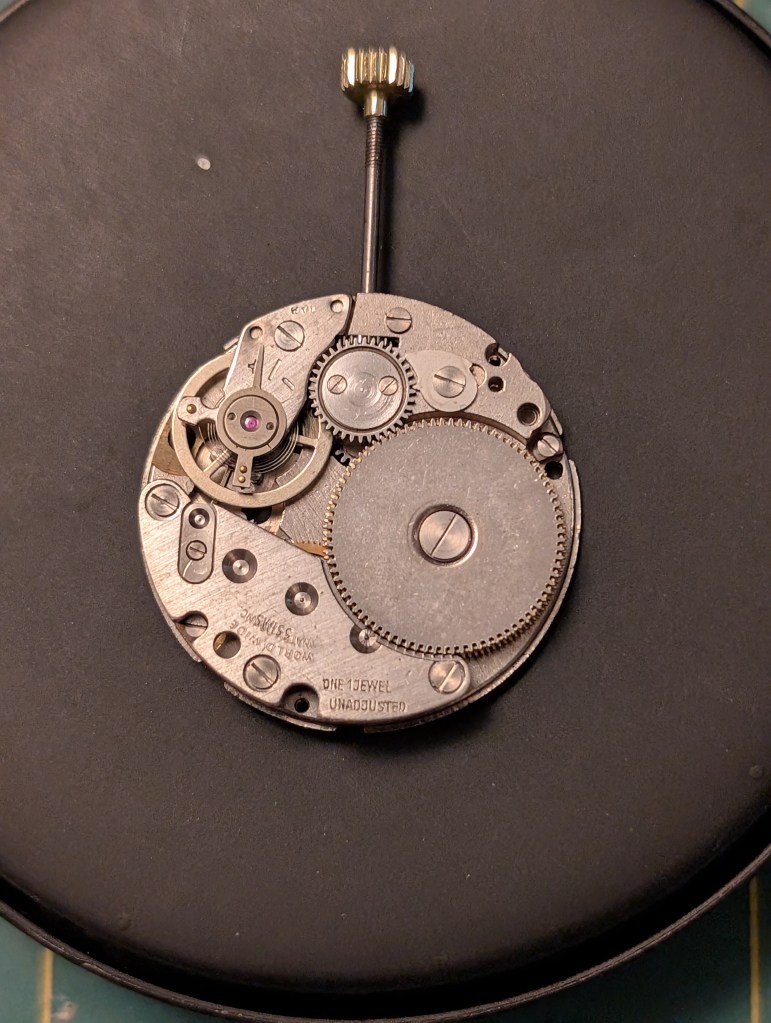 It’s been awhile, and I forgot where I was. It was mostly disassembled, but I think I recall difficulties getting the barrel out. But, I took a screwdriver to it and it came out just fine, so maybe I was mistaken. The barrel cover doesn’t really snap in at all, so note to future self: be careful handling the barrel. Overall the movement seems to be in decent shape, and fairly clean. I noticed that the balance wheel has an excessive amount of end-shake, but after putting the weird shock-plate thing back on (see below), it seems to have lessened.