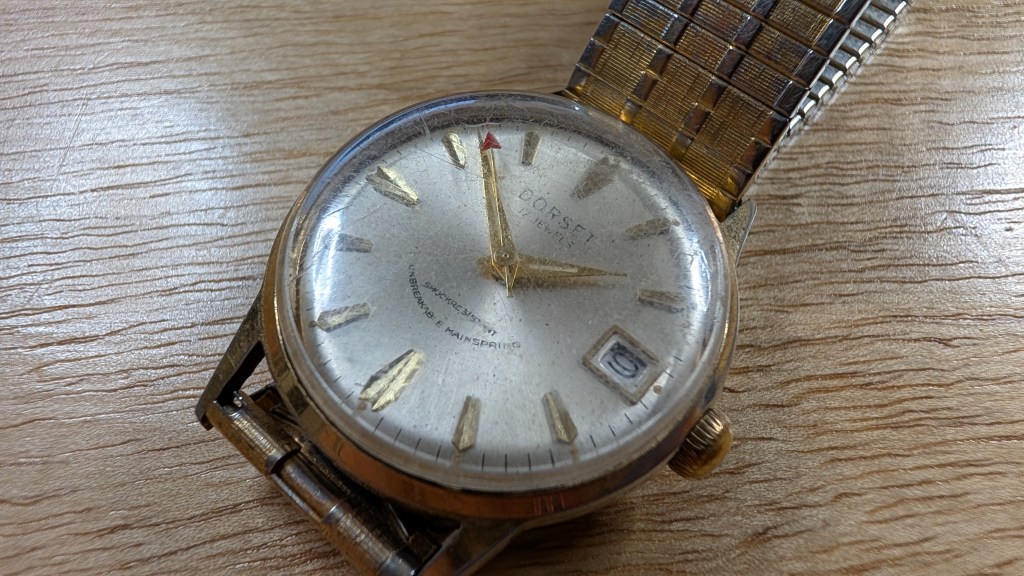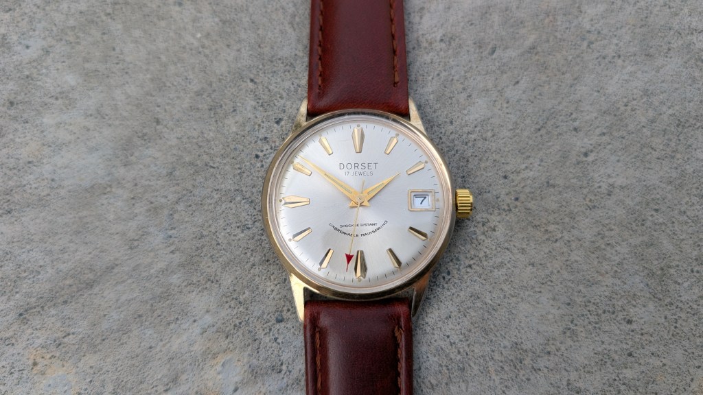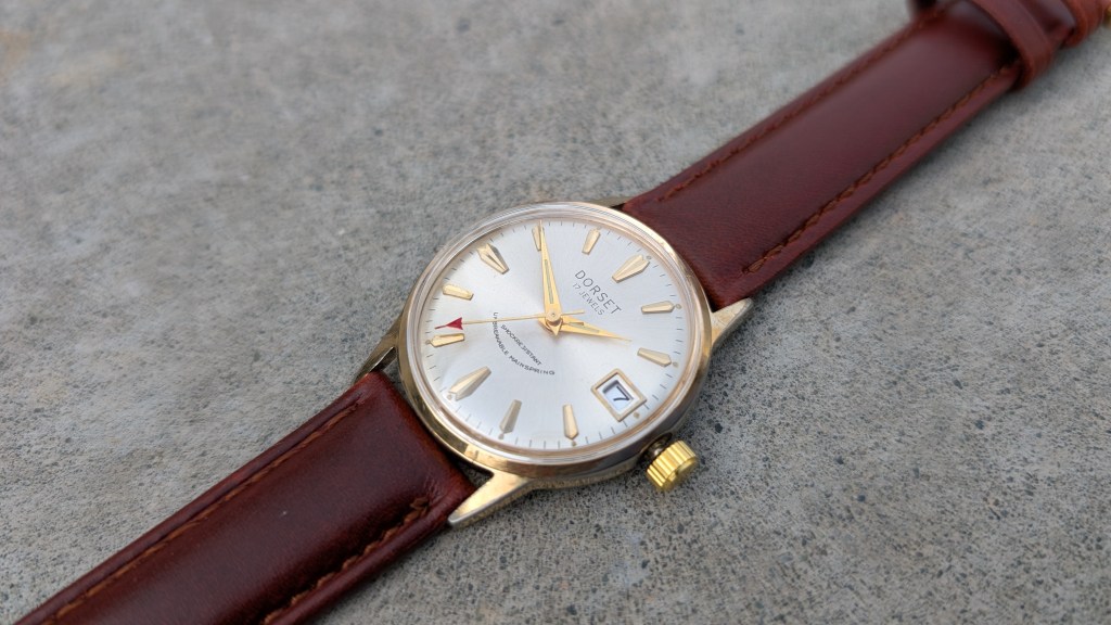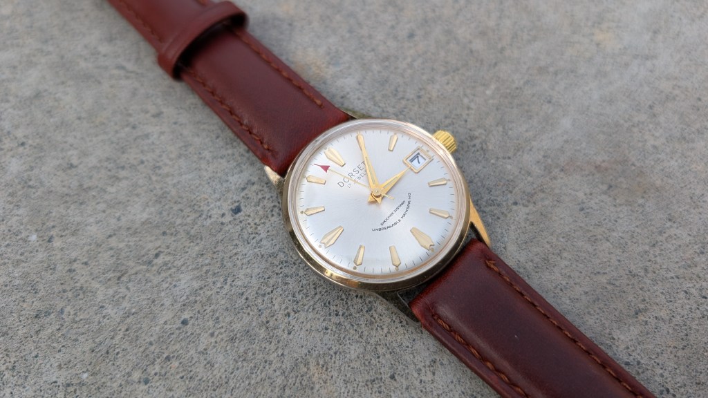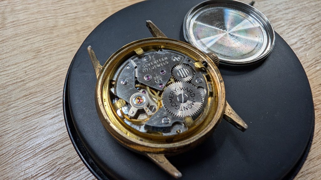 After opening this up, it’s got a super cool movement, from a company I’ve not heard of before: UTC-Unitime. Apparently they coordinated with Seiko to use their movements in more mass-produced/cheaper watches, under a variety of brand names. What’s interesting here is that the dial says “Dorset”, but the ratchet wheel says “Montgomery Ward”.