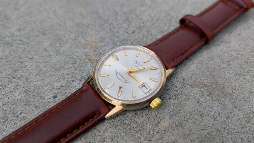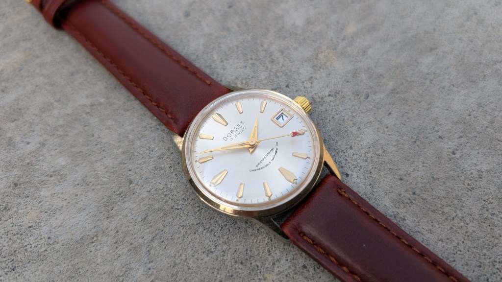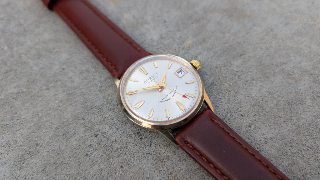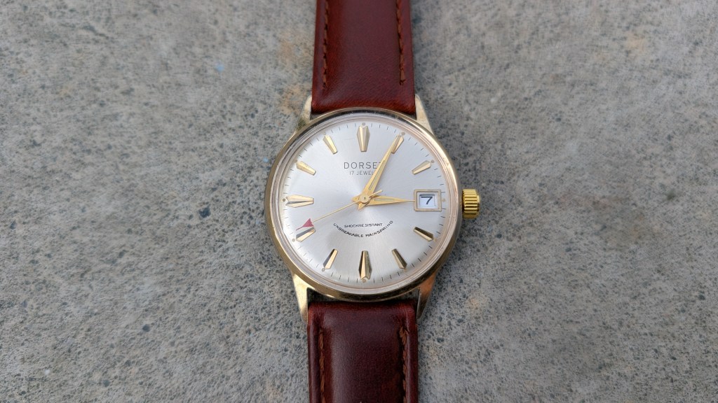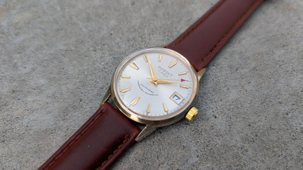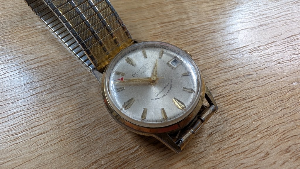 After opening this up, it’s got a super cool movement, from a company I’ve not heard of before: UTC-Unitime. Apparently they coordinated with Seiko to use their movements in more mass-produced/cheaper watches, under a variety of brand names. What’s interesting here is that the dial says “Dorset”, but the ratchet wheel says “Montgomery Ward”.