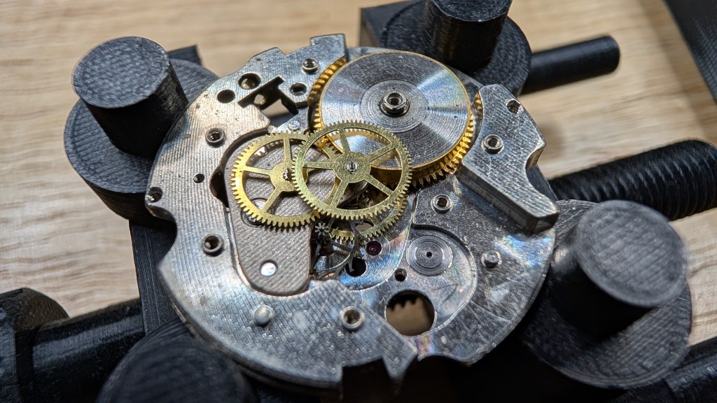 Alas! It seems the cannon pinion is too loose. I was almost done with the movement, and when setting the hands, I could slide the minute hand willy-nilly. So, I’ll need to open it back up and tighten the cannon pinion. It’s a risky operation, especially without the correct tool. I’ve done it before though.