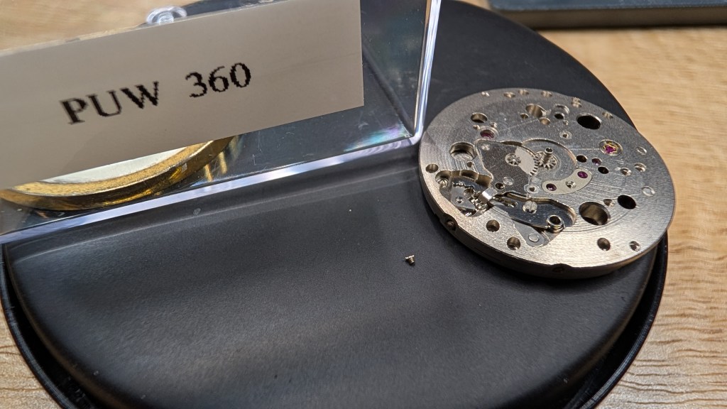 However, once I got to the last of three screws for the plate, the screw ended up shearing off half of the head! Fortunately, I could still unscrew it with some careful angling of the screwdriver. I ended up scavenging a screw from the PUW 360, from the escape wheel cap jewel plate: