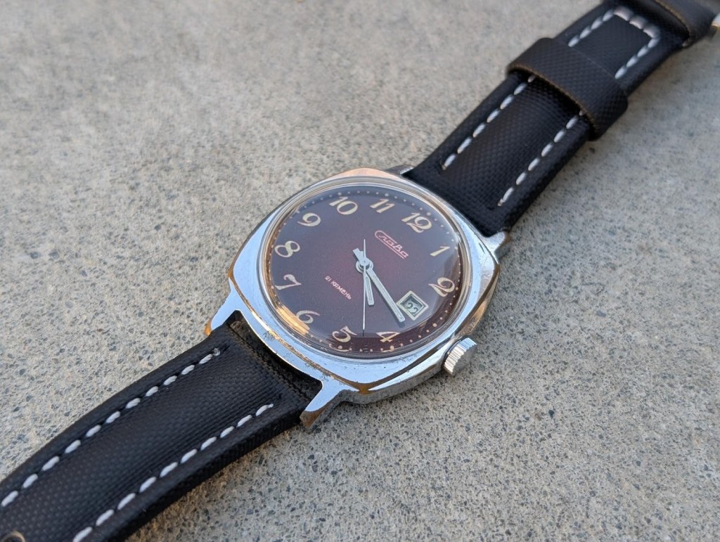 It’s difficult to date the second watch, since there isn’t a lot of information around serial numbers for Slava watches from this period of time. My best estimate is that it was made sometime in the 70’s or maybe early 80’s. The 2414 movement was first launched in 1966 [ref]. According to this random Wix site (which appears to be a copy-paste of this dude’s personal blog site), Slava partnered with Italy to import Slava watches, which received a special “CCCP” stamp on the case back up until the 1980’s. And this Etsy listing with the same movement and a similar serial number on the case back claims to be from the 70’s-80’s.