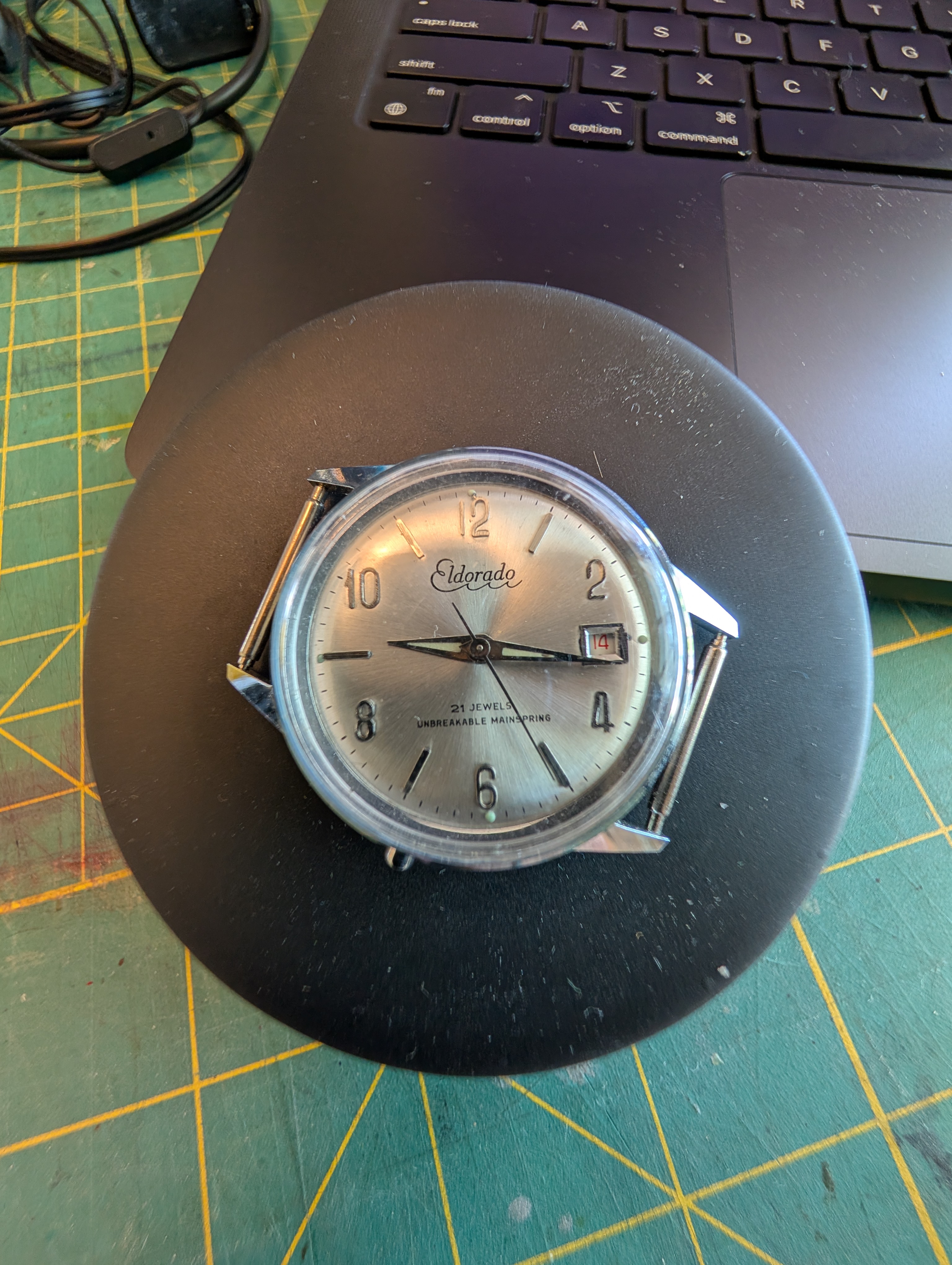So, I ordered a properly sized gasket, took out the dial and took off the old decal, and replaced the dial spring with the one from the Eldorado. That spring seems to work much better. I think I’m going to try and put the decal on top of the polished metal, and see how that looks. I did a first pass at polishing, but now that I’m looking at it I can still see a bunch of small scratches, so I’ll probably do another pass again before applying the decal.