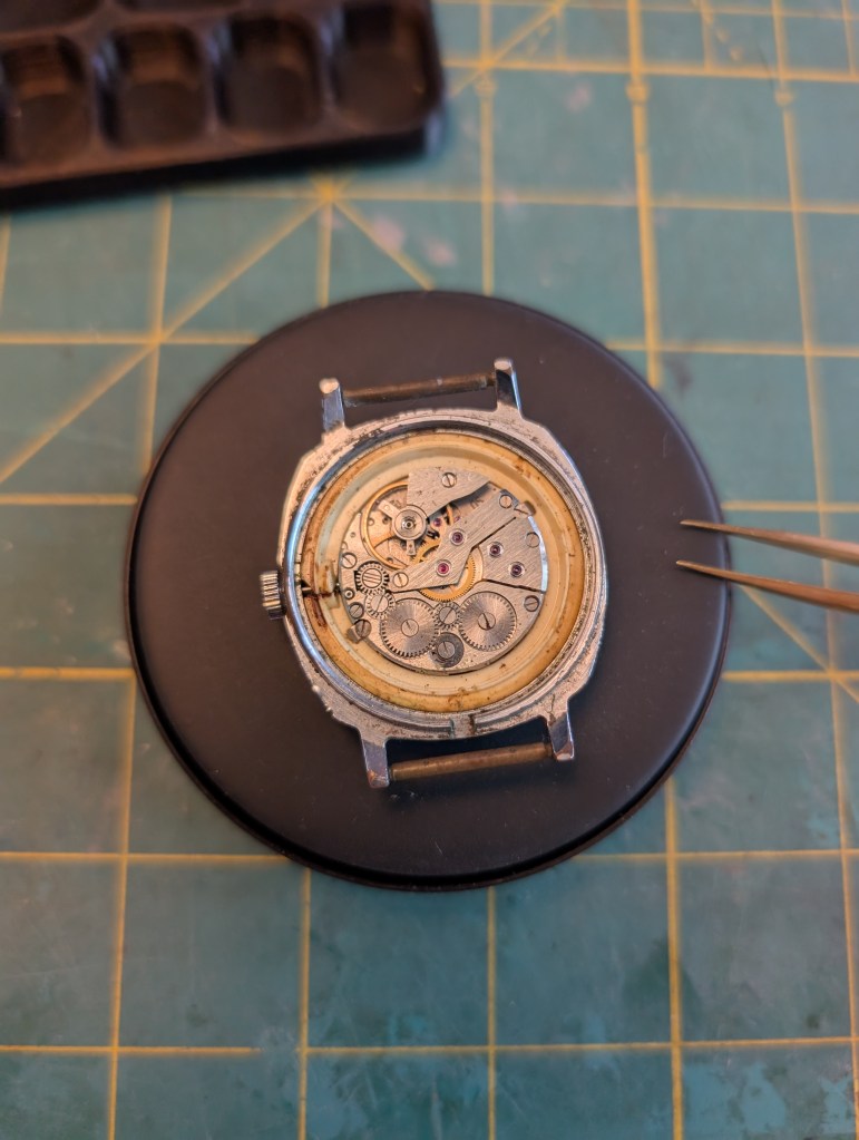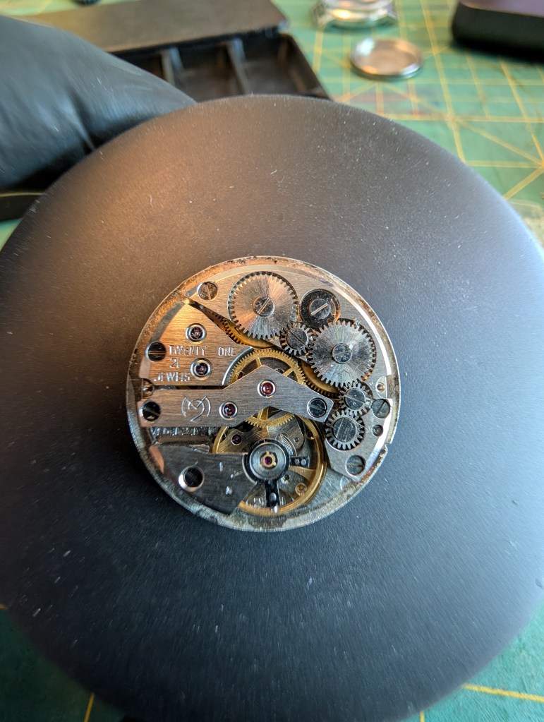 The stem I used to wind it definitely won’t work , since the gap for the setting lever isn’t in the correct location. I contemplated somehow modifying the stem to fit correctly, but that would be a whole thing that would probably end up not working very well. For the time being, I can at least work on the movement though, and keep my eyes peeled for a donor movement and/or a winding stem.