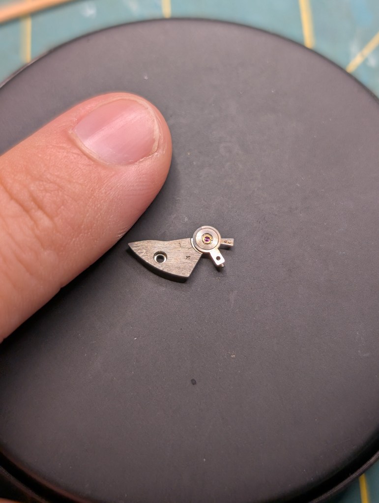 I started taking the dial off, so I could make a 3D model of the movement spacer. Then, I noticed it wasn’t running anymore! I saw that the balance was still oscillating freely, but the pallet wasn’t moving. What! So I took the balance out, and lo and behold, the impulse jewel was nowhere to be found.