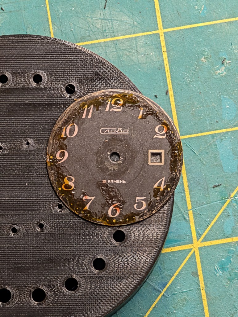 - The dial is completely cooked; it’s covered in glue all around the edge, and wherever the glue came up, it took the paint with it.