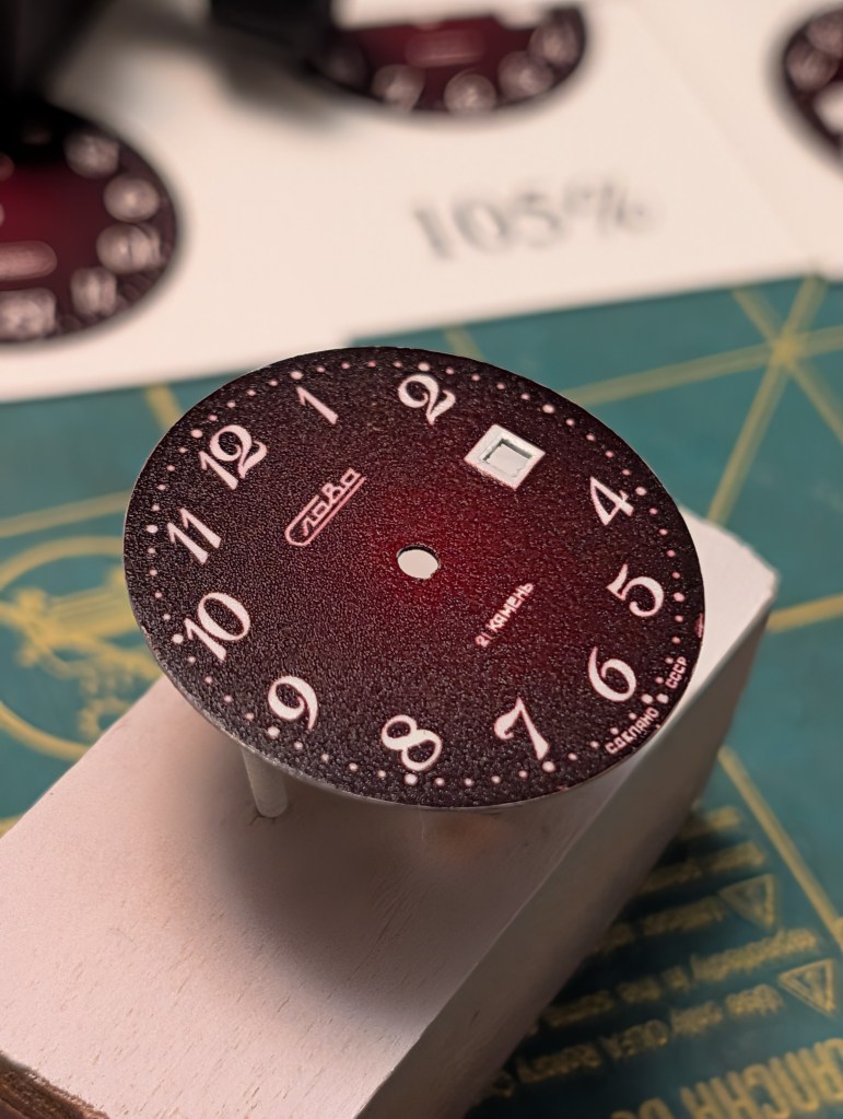 I took the liberty of adding a slight red gradient at the center of the dial, along with adding a “Сделано в СССР” (“Made in USSR”) at the bottom. The colors bled a little bit, and I didn’t get it absolutely perfectly centered, but I am quite happy with how it turned out anyways.