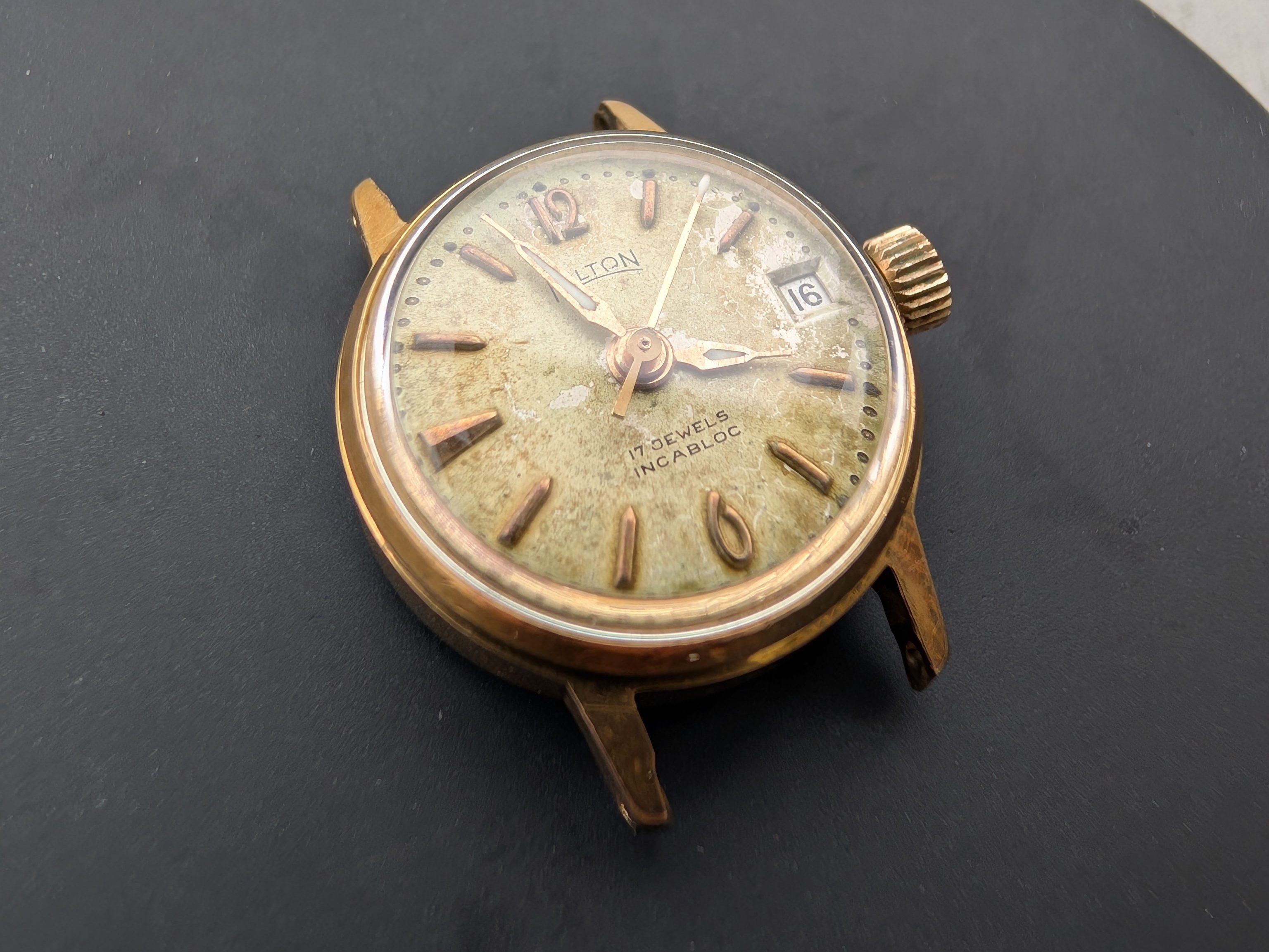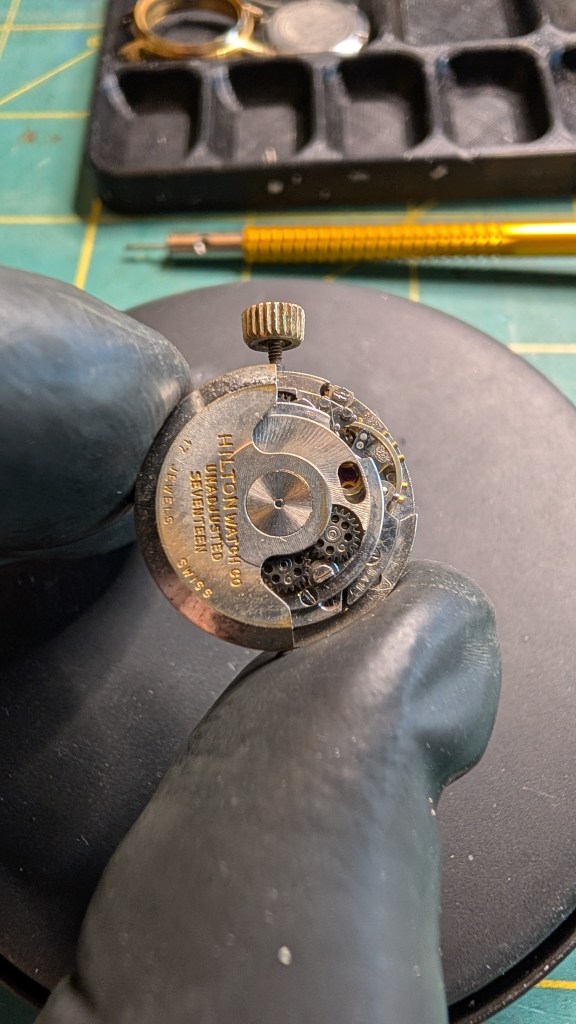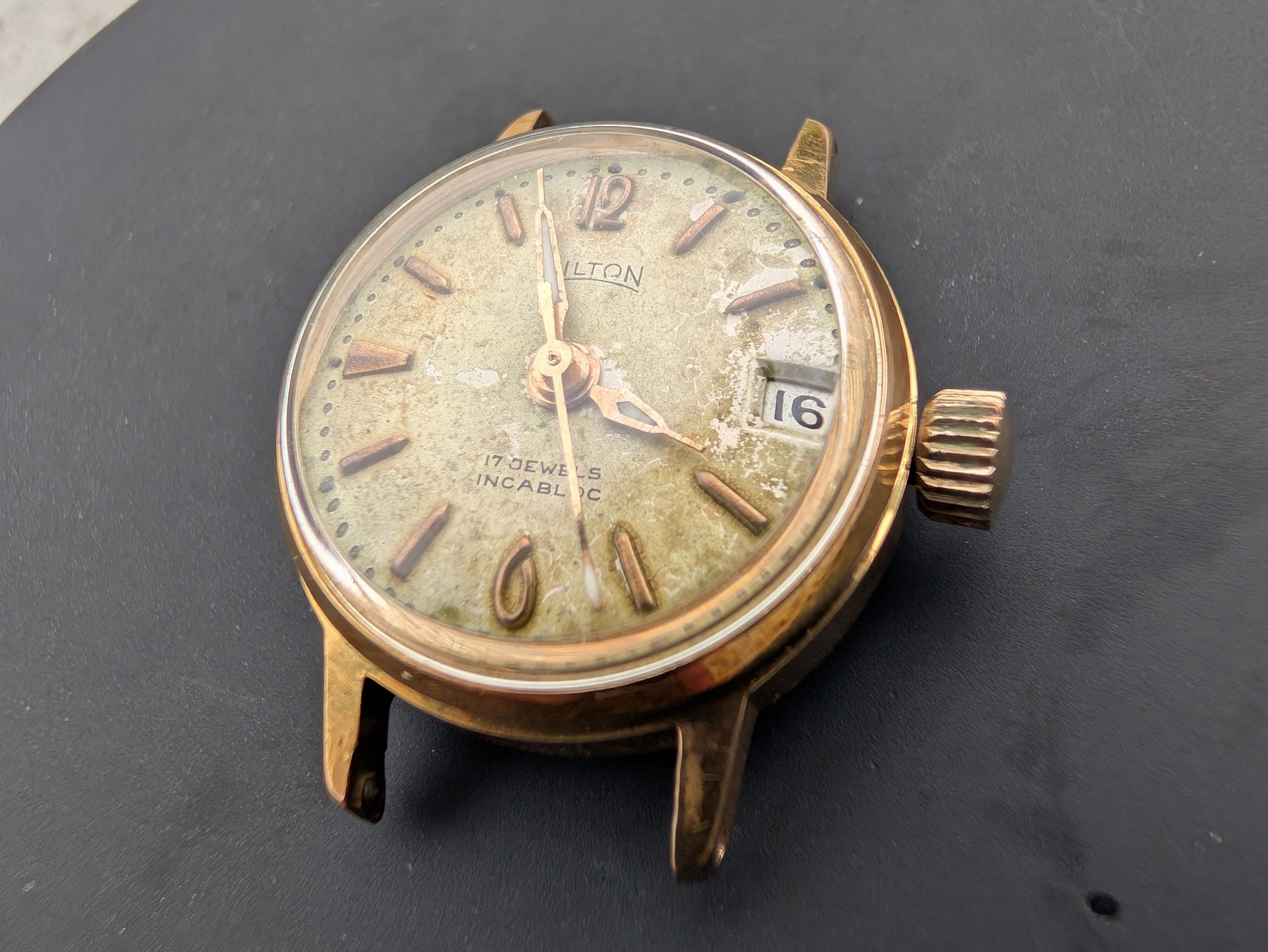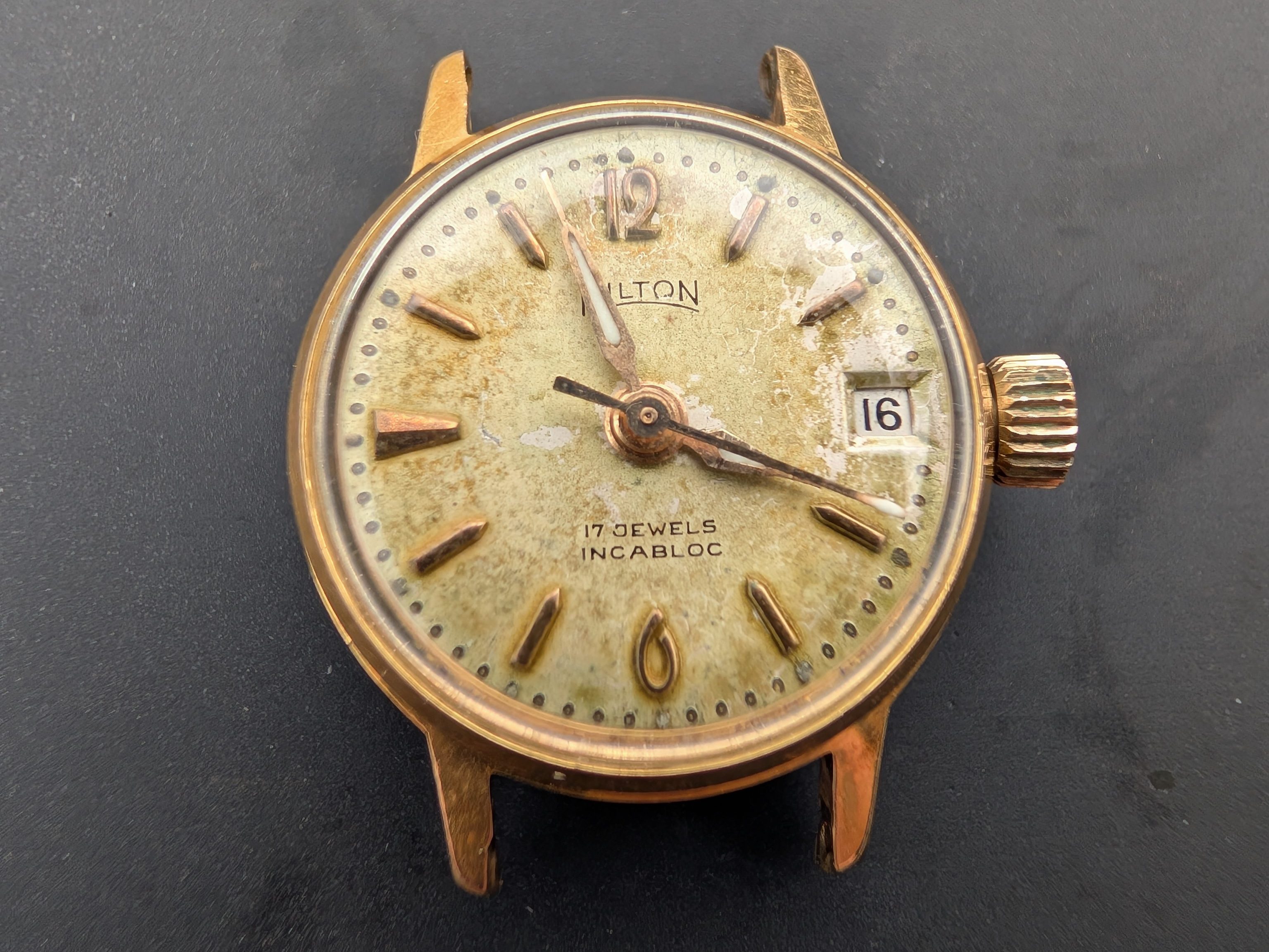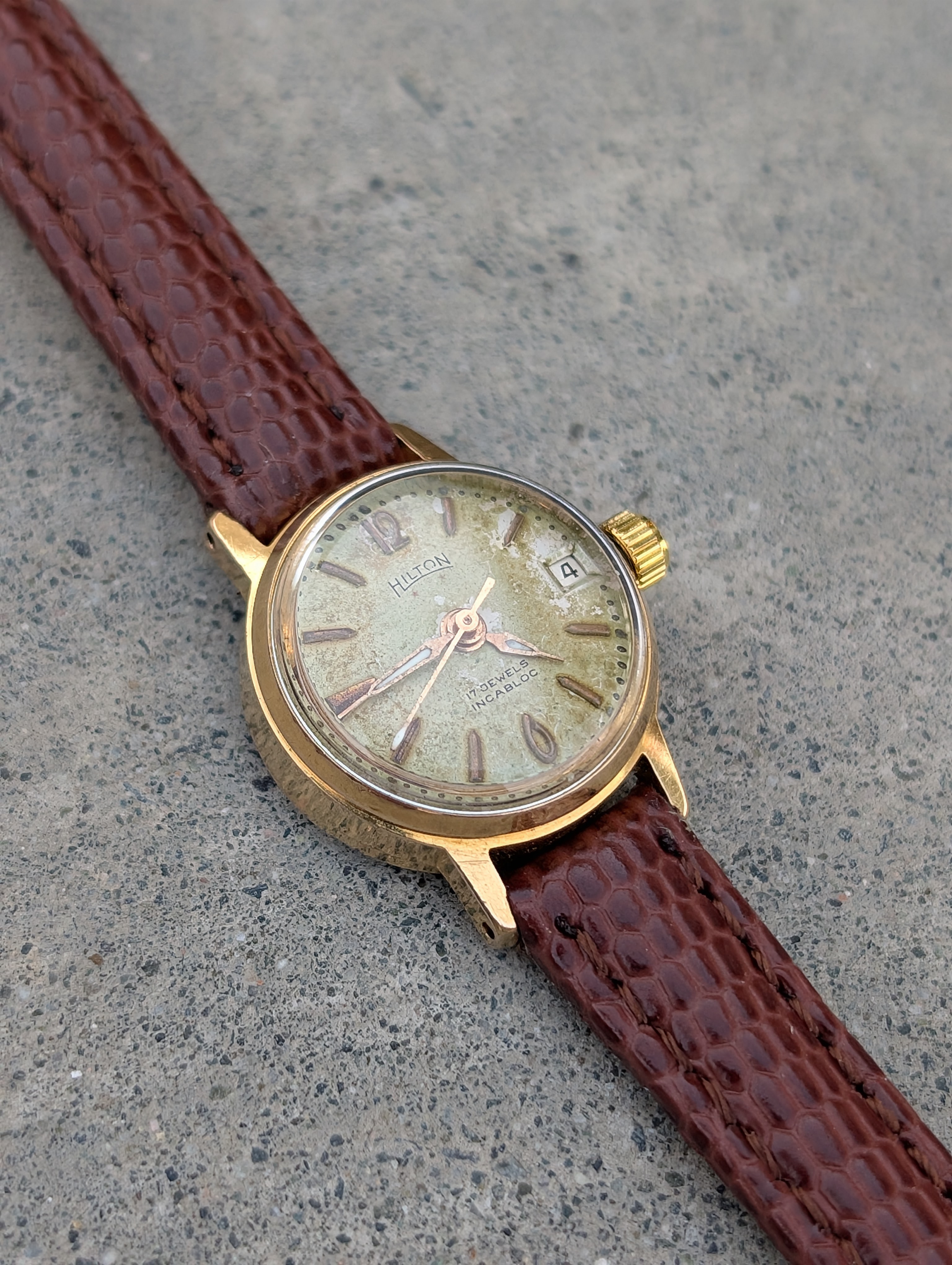 The eBay listing didn’t show the case opened, so I’m going in a little blind. After reading a bit about the Hilton Watch Company, it seems it was another branding company that wrapped Swiss movements in cheap cases, from the 1960s. My guess is that it will contain an A. Schild movement of some kind, and judging from the thickness of the case, it may actually be an automatic. The listing also mentioned that it ran for 4 hours, which is very promising.