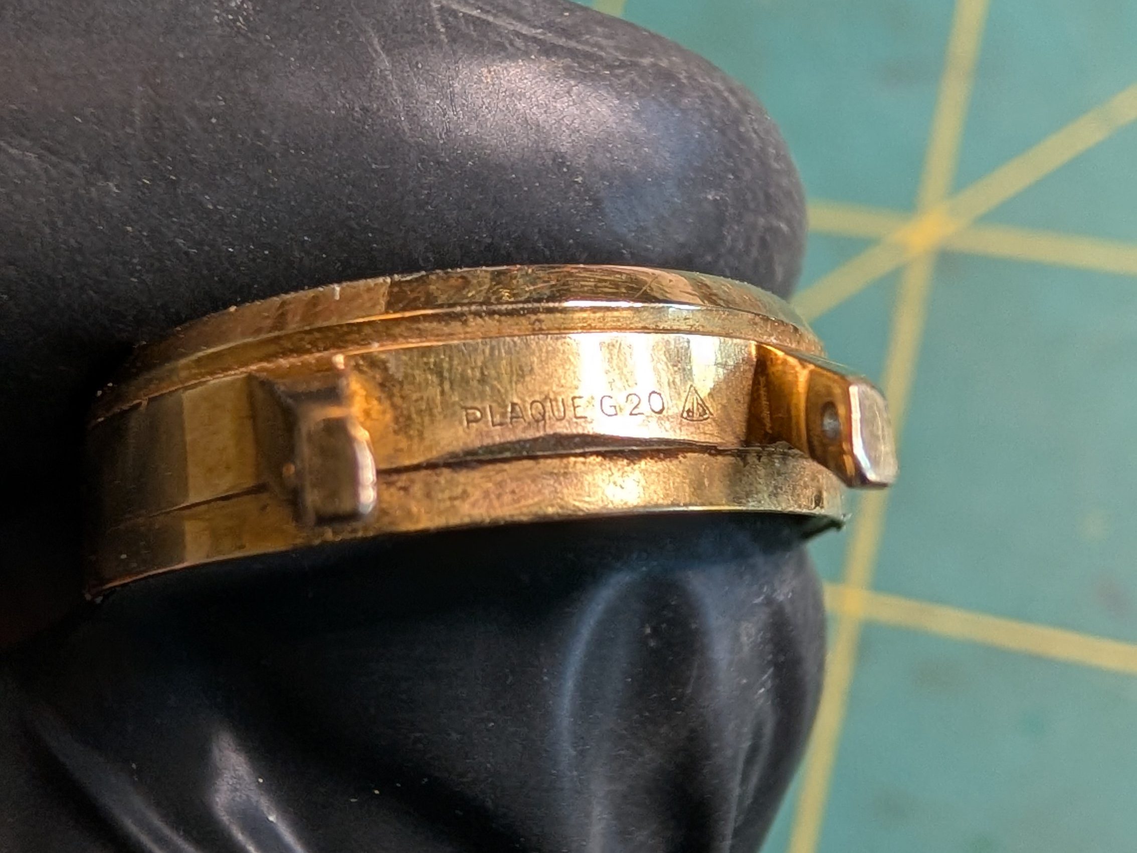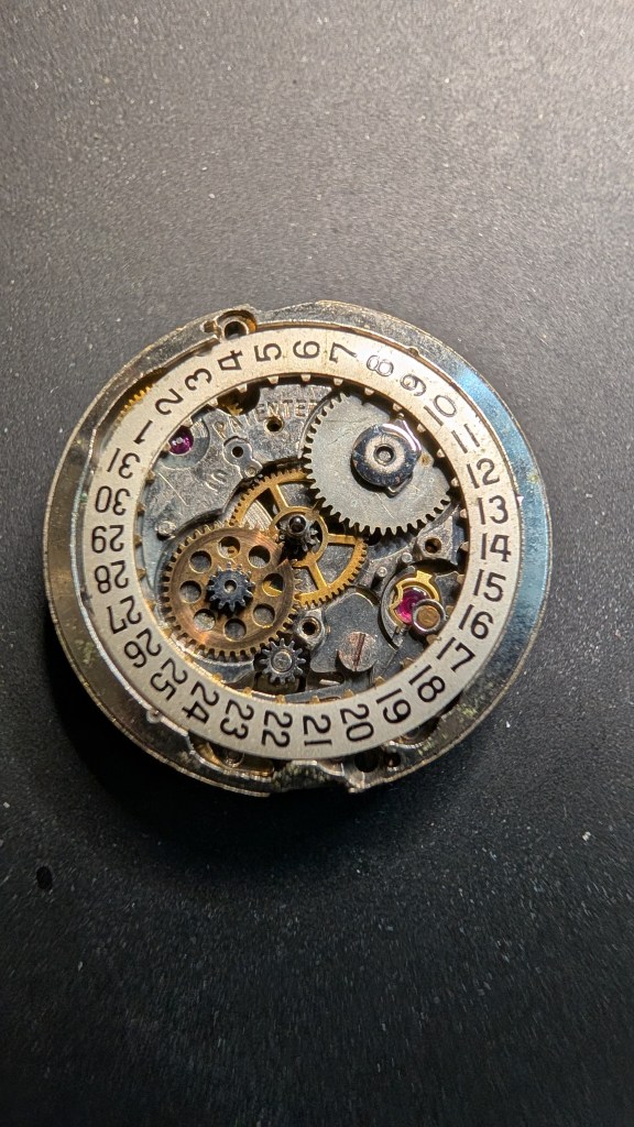 The case is in OK condition, with not too many areas worn down to the brass, just a lot of tiny scratches. The case back is pretty scratched up, but they seem not too deep. The crystal is pretty cracked, so I’ll probably replace it. It’s not running, but the hands are able to be set, and the date clicks over at midnight.