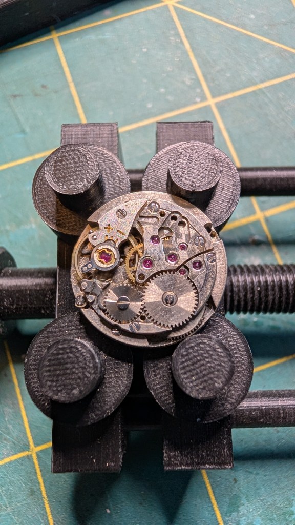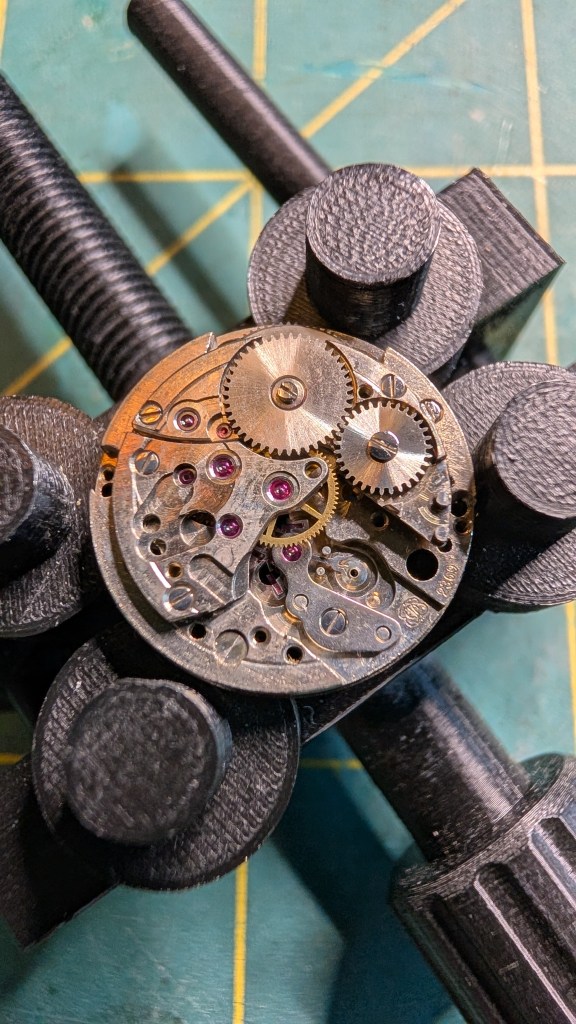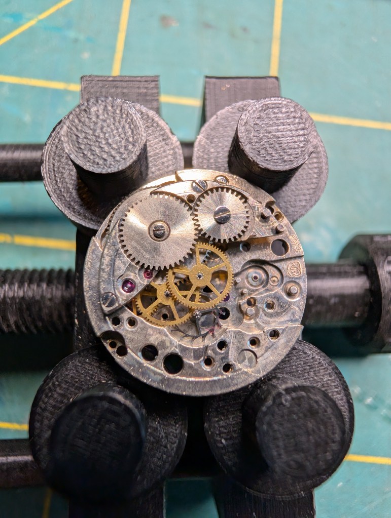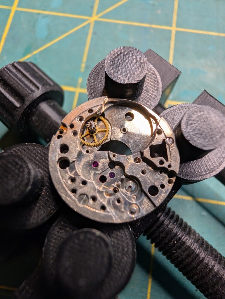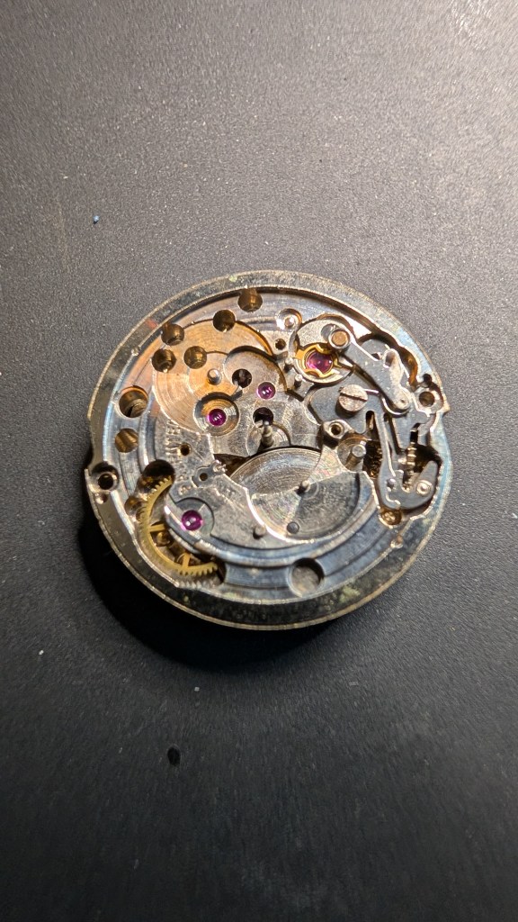 After disassembling it, a cursory look at the jewels and pivots seem to show that it’s in pretty decent shape, and not even that dirty. I’m still gonna run it through the ultrasonic, so hopefully with that + pegging the holes, it’ll be running really nicely.